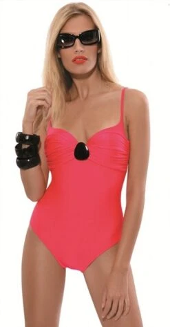 Die Halbschalen-Cups mit Bügel sind leicht geschäumt und ausgeformt. Der Badeanzug ist komplett mit weichem Feinjersey gefüttert und daher blickdicht. Er ist mit B- oder C- Cup erhältlich. Die Träger sind elastisch, aber nicht verstellbar. Sie können auf der Rückseite abgenommen werden und bieten dann weitere Tragevarianten – z.B. als Neckholder.