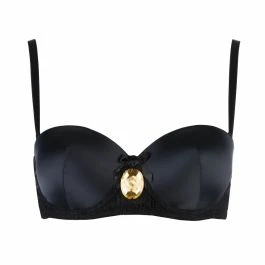 Dieser Balconett- BH besteht aus schwarzem Stretch-Satin und schwarzer Spitze. Die ausgeformten Schalen mit Bügel sind leicht geschäumt. Die elastischen Träger sind längenverstellbar. Sie können außerdem abgenommen werden, so dass der BH trägerlos getragen werden kann. Ein eingearbeitetes Haftband sorgt für Halt. Das Decolleté ziert ein Satin-Schleifchen und großer, bernsteinfarbener Medaillon-Kristall.