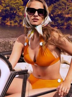 Die 3/4 Schalen Cups sind nicht wattiert und mit Bügel – sie passen am Besten für kleine Cups. Auf der Rückseite und im Nacken wird das Oberteil gebunden. Der knappe Slip hat seitliche Bändchen, die verstellbar sind.
