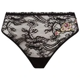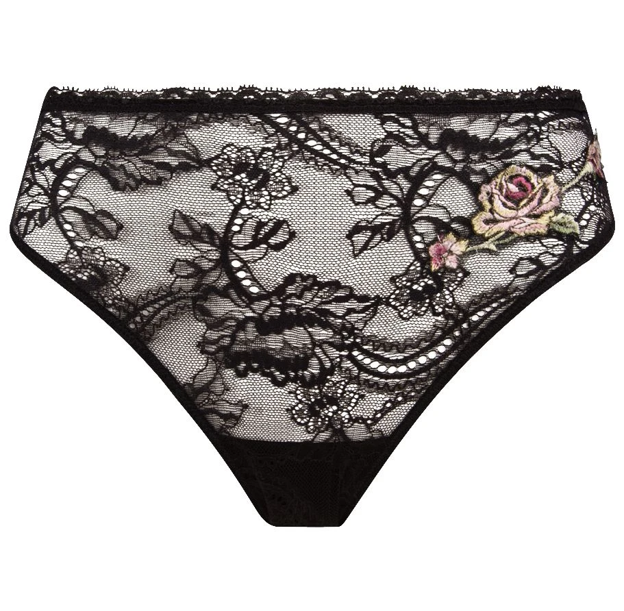 Den verführerischen Slip gibt es in der Farbe Rose Ebene, einer schwarzen Spitze mit rosanen Blumenstickereien. Das Dessousunterteil ist in den Größen 36 bis 46 erhältlich.