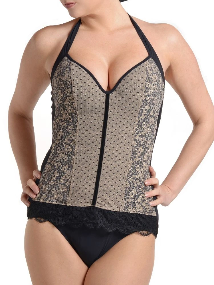 Der Badeanzug ist aus weichem Feinjersey gearbeitet und im vorderen Teil komplett doppellagig. Vorne unten ist er etwas ĂŒberlappend und mit einem Saum aus echter schwarzer Spitze gestaltet – hierdurch entsteht der Eindruck eines Tankinis, was den Badeanzug angenehm figur-kaschierend macht und die Beinausschnitte oben etwas abdeckt ohne einzuengen. Er ist mit B- Cup ausgestattet. Dieser Badeanzug ist in den GröĂen 36 bis 46 (deutsche DamengröĂen) und in der Farbe nude mit schwarz erhĂ€ltlich.