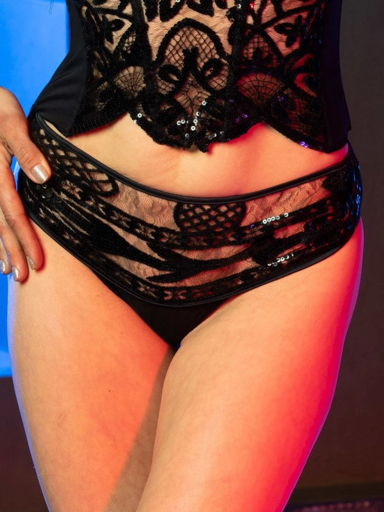 Der Paillettenslip Noyon aus der limitierten RC Private Collection „Notre Dame“ von RCrescentini besteht aus elastischer, schwarzer Tüllspitze mit Paillettenverzierung. Der Slip in Brasiliana Form besteht aus Tüllspitze mit Satindetails und ist transparent.