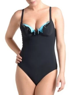 Der Badeanzug ist aus hochwertigem Feinjersey gearbeitet. Im Bereich des Decolletes ist er kontrastierend in leuchtendem türkis abgefüttert und mit Rüschen gestaltet. Außerdem sind hier Details aus Lack-Look Material und eine gefütterte Schleife aufgesetzt, was aus dem ansonsten schlicht schwarzen Badeanzug etwas ganz besonderes macht. Der Badeanzug ist mit B-Cup in den Größen 36 bis 44 (deutsche Damengrößen) in der Farbe schwarz mit türkis erhältlich.