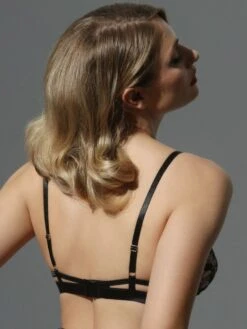 Der Triangel BH Rita von Prelude Milano ist verführerische Reizwäsche Made in Europe. Die Rita Kollektion ist die Nachfolge Serie der beliebten „Greta“ Kollektion von Prelude Milano. Die Wäsche aus dieser Serie besteht aus besticktem hautfarbenem Tüll und schwarzem Satin. Besonderes raffiniert sind die Bändchen Details im Strapslook.